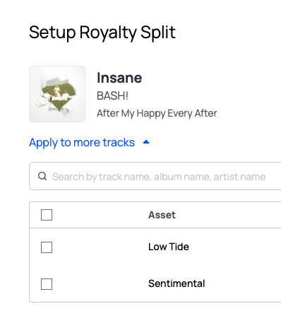 If multiple songs share the same splits, use our bulk feature for efficiency. Click “Apply to more tracks” when setting up the splits, and these will be assigned to all selected songs.